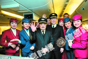2012年南航最后一个航班飞机落地后,机组人员合影留念。信息时报记者 萧嘉宁 摄