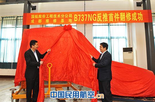近日, 国航股份工程技术分公司成都维修基地成功完成了首件B737NG飞机反推部件翻修工作,并于2013年3月8日举行了该机型反推翻修航材交付仪式。此项目标志着该基地在拓展维修能力、打造品牌方面又迈出了坚实的一步,也为提升国航机务维修领域核心竞争力增添了厚重的筹码。