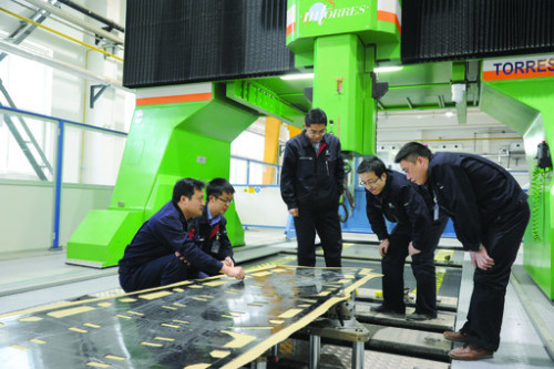 中航工业西飞引进的数控激光刻型机及柔性夹具系统,自去年6月份完成安装调试工作后,目前已经成功应用于生产中,特别是在新机研制中发挥了重要作用。该设备交付应用至今,完成零件刻型涉及5个机型、15个项目,零件数量500多件,交付合格率100%。该设备的应用,将逐步取代原始的化铣样板,降低劳动强度,提高生产效率和化铣质量。图为使用单位负责人与技术人员、操作工人在现场对比查看零件刻型情况。