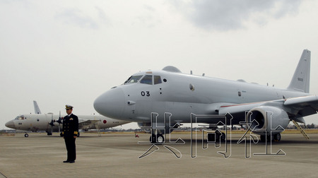 图为3月29日下午抵达神奈川县厚木基地的海上自卫队新型喷气式反潜巡逻机“P-1”。左后方为现有的反潜巡逻机“P-3C”。