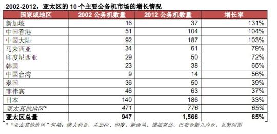 2002-2012,亚太区的10个主要公务机市场的增长情况