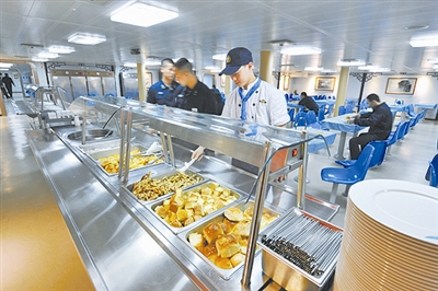适应航母全时工作理念,航母餐厅在正餐基础上设置了间餐,提供糕点、水果饮料等,保证了舰员随时能吃到可口的食品。