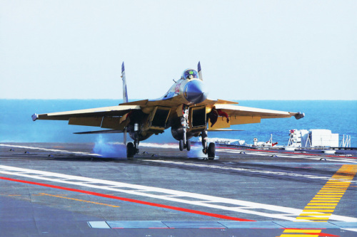 中国“辽宁舰”航母舰载航空兵的主力是歼-15歼击机。《南华早报》2012年11月24日披露称,歼-15已经由试飞员戴明盟驾驶在航母甲板上顺利着陆,从而标志着中国正式成为拥有喷气式舰载歼击机的新兴海军大国。 俄媒称,歼-15的研制历史值得关注。上世纪90年代末,中国试图从俄罗斯采购50架苏-33舰载歼击机。但是在就可能的合同进行谈判期间,中方希望购买的飞机数量持续减少,最终减至2架。不难猜测,两架歼击机根本无法配备一艘航母,只可能会被中国用来仿制,随后生产类似的国产舰载机。虽然俄罗斯航空制造业当时的经济状况较为严峻,急需新合同,最终还是拒绝了中国,没有向中国出售一架苏-33。不久以后中国就与乌克兰就出售一架苏-33的原型机T-10K以及某些相关文献达成一致。2010年夏有报道称,中国自主研制的歼-15舰载歼击机成功首飞。
