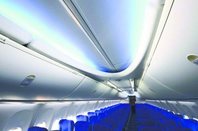 “这架飞机内饰有很大不同,灯光不再是刺眼白色,有白天、夜晚模式,十分柔和!”蔡治洲说,采用天花板凹形LED灯光照明,根据登机、起飞、用餐、休息等不同飞行阶段或服务阶段,选择不同的灯光颜色和明暗度模式。在夜间飞行时,客舱灯光光线由亮变暗,衬托蓝色背椅,如同在蓝色海洋,十分温馨。行李架改为下拉式的,更易打开。