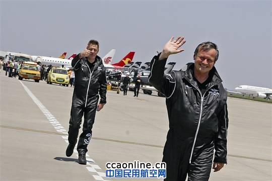 法国“百年灵”表演队的成员跟记者挥手示意。摄影:王诚