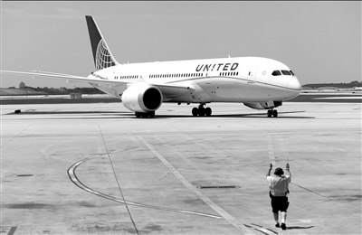 当地时间5月20日,美国芝加哥,美国联合航空公司旗下一架波音787梦想客机准备从休斯敦飞抵芝加哥。图/CFP