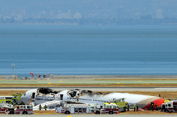2013年7月6日,在美国旧金山国际机场,救援人员在发生事故的波音777飞机旁工作。