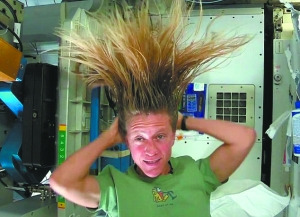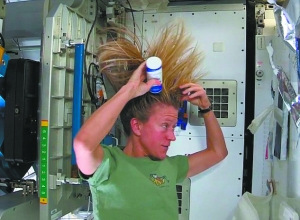 卡伦拥有一头过肩长发,在太空里这些头发全都竖了起来,显得“怒发冲冠”。在国际空间站里,水不会像地球上那样从高往低流,而是会变成无数小水珠到处乱飘。