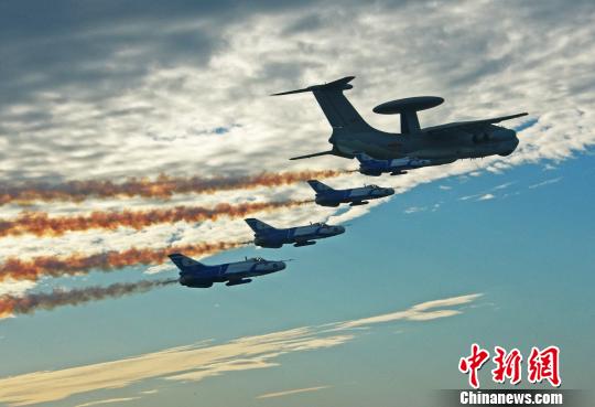 国产预警飞机经过严格试飞定型后,装备部队并参与执行新中国成立60周年大阅兵任务。图为预警机和护卫飞机进行飞行编队训练。 谭超 摄