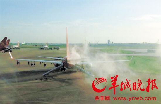 25日18时许,几条网友的微博引起了市民的高度关注。据网友描述,深圳宝安机场一架停在停机坪上已经上了乘客准备起飞的飞机尾部着火。记者从网友所拍图片中看到,现场有人陆续从飞机紧急滑道上下来,消防已在灭火降温。据深圳机场相关负责人透露,该架飞机为波音737,从深圳飞往北京,航班号为ZH9969,为延误状态。