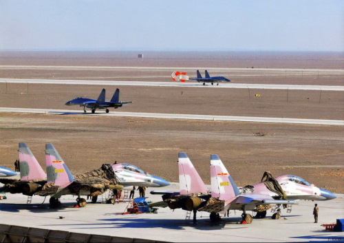 解放军广空部队粉色涂装苏-30MKK假想敌战机部队在西北基地与歼11战机对抗训练照曝光。