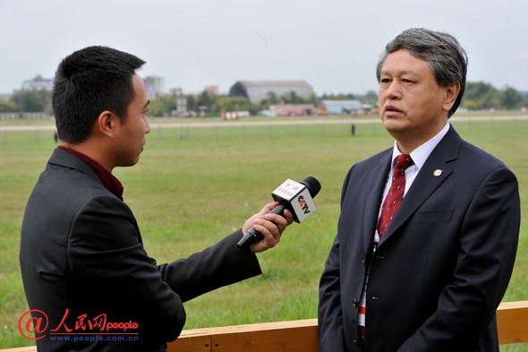 2013年8月27日上午,中国航空技术国际控股有限公司董事长马福安(右)在第11届莫斯科航展上接受中央电视台记者采访。 摄影:人民网 杨铁虎