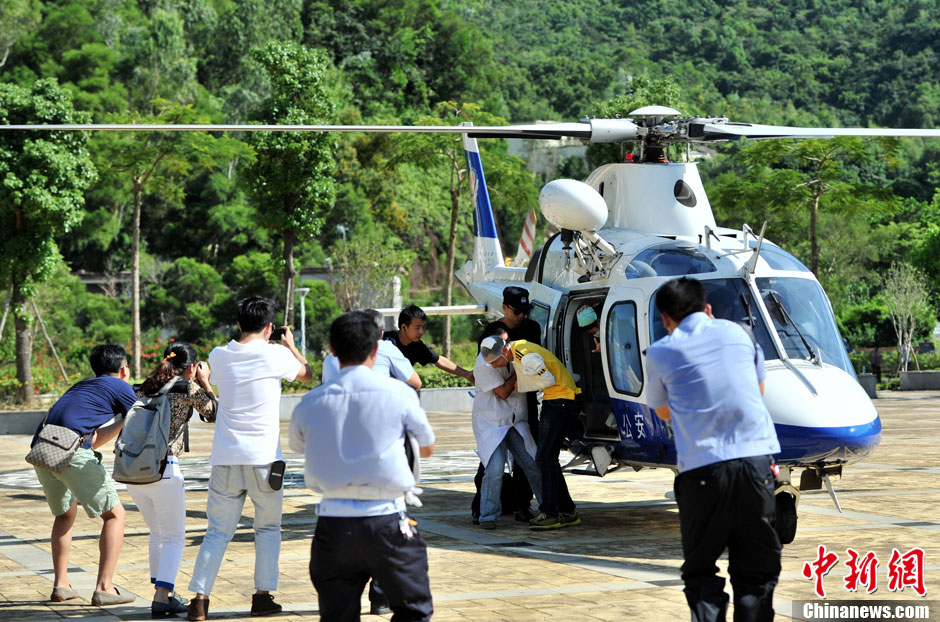 8月27日,深圳市公安局交警支队在大鹏新区西涌举行突发交通事故应急演练。演练模拟该地区车流量大,发生事故后该路段出现拥堵,处置和救援人员无法进入事故现场,急调警用直升机飞赴事故现场进行处置,转移救治“伤员”。中新社发 陈文 摄