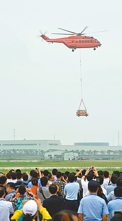 5日,开幕式上,飞行员驾驶13吨重的AC313直升机,模拟将交通事故中受损的车辆吊离现场。