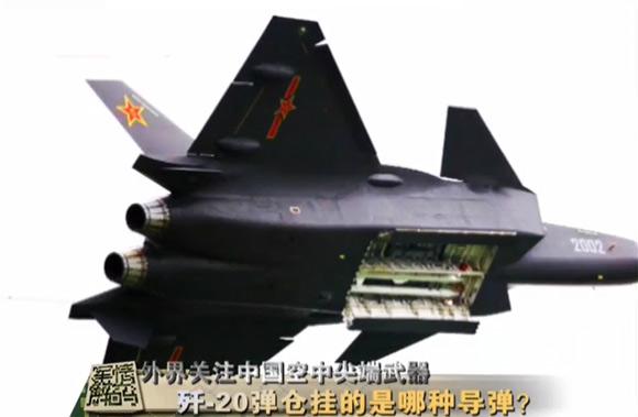 据美国军事网站“战略之页”报道,在中国互联网上流传的一组照片和视频清晰的展示了歼-20(编号2002)隐形战斗机在飞行中打开武器舱,弹出导弹架的过程。从视频中可以看到,歼-20战机的导弹发射架与装备在美国F-22“猛禽”喷气式隐形战斗机上的完全不同。歼-20的武器舱门关闭后,导弹依然挂在发射架上。这样的设计有利于减小阻力和飞机的雷达反射面积,是一种非常好的隐身设计。