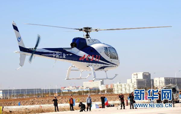 由中国航空工业集团公司自主研制的国产轻型多用途直升机AC311在中航直升机天津分公司完成总装下线,于11月8日在天津成功首飞。AC311直升机的首飞成功、由天津总装的首架AC301直升机实现客户接机,标志着中国AC系列民用直升机产品开发迈上新台阶。据介绍,AC311直升机是性能优越的2吨级轻型多用途直升机,可广泛应用于飞行训练、人员运输、公安执法、通信指挥、航拍摄影、医疗救护、电力巡线、护林防火、飞播灭虫等任务。与AC311一同飞行的直升机是同一系列的轻型直升机AC301。AC301是天津基地完成总装的首架直升机,将由中国飞龙通用航空公司接收并投入运营。新华社记者刘海峰摄