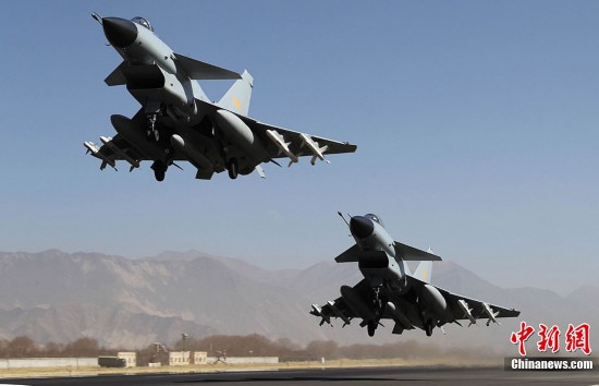 1月31日,雪域高原阳光明媚,万里无云。驻藏空军某军用机场战鹰列阵,车辆奔流,战士们在紧张有序中拉开龙年新春首飞的序幕。图为10时30分战鹰准时编队起飞。中新社发 刘应华 摄 图片来源:CNSPHOTO