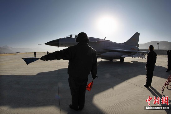 1月31日,雪域高原阳光明媚,万里无云。驻藏空军某军用机场战鹰列阵,车辆奔流,战士们在紧张有序中拉开龙年新春首飞的序幕。图为战机滑出停机坪准备起飞。中新社发 刘应华 摄 图片来源:CNSPHOTO