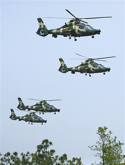 资料图:6月12日,南京军区某陆航旅直升机编队利用山谷地形进行超低空突防。郭维虎摄