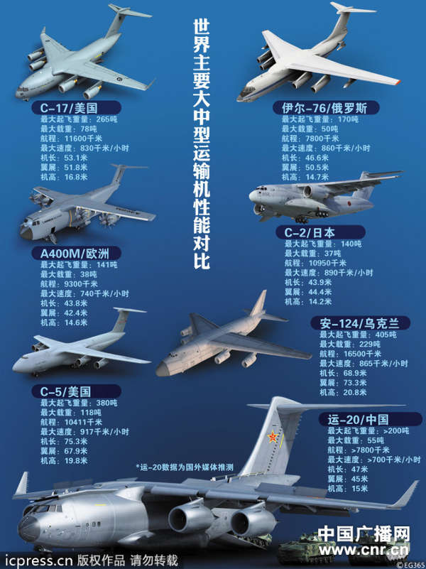 “运-20”,机体长47米,翼展45米,高15米,实用升限是13000米,最高载重量是66吨,最大起飞重量220吨,因此跻身全球十大运力最强运输机之列。“运-20”的首次飞意味着中国空军向战略空军迈出了坚实的一步。