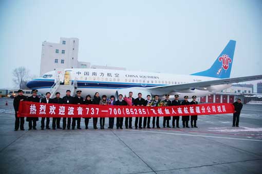 2月13日19时35分,一架机号为B5285的全新波音737-700型飞机由美国西雅图经广州飞抵乌鲁木齐国际机场,加盟南航新疆分公司波音737机队。据悉,这是南航新疆分公司继昨日新到一架E190客机后,今年接收的第2架全新客机。