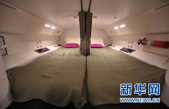 这是飞机内的机组人员休息室(12月9日摄)。 12月9日,波音787“梦想”飞机飞抵海口美兰国际机场,开始为期2天的全球巡展海口站活动。此前波音公司于12月4日在北京启动了787飞机全球巡展“梦想之旅”,之后将于11日飞赴非洲。波音787可搭载乘客210至250名,航程达14200至15200千米,飞行速度0.85马赫。 新华社记者 郭程摄