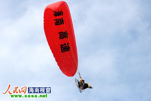 21日上午8点左右,经过一天的休整,2011环海南岛飞行拉力赛东方段在东方市边贸城正式开幕。比起前几日的大风天气,今天的风速明显减弱,在海口未能与广大市民和游客见面的热气球、动力伞、动力三角翼今天也终于如愿升空,在东方的碧海蓝天间尽情的翱翔。大批东方市民赶到现场,一幕幕精彩的飞行表演引得现场尖叫连连、掌声不断。