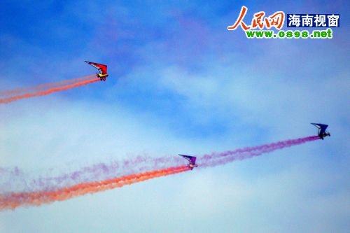 21日上午8点左右,经过一天的休整,2011环海南岛飞行拉力赛东方段在东方市边贸城正式开幕。比起前几日的大风天气,今天的风速明显减弱,在海口未能与广大市民和游客见面的热气球、动力伞、动力三角翼今天也终于如愿升空,在东方的碧海蓝天间尽情的翱翔。大批东方市民赶到现场,一幕幕精彩的飞行表演引得现场尖叫连连、掌声不断。