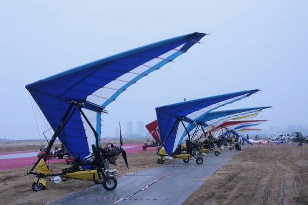 在海口市万绿园后观海台赛点,动力悬挂滑翔机整装待发