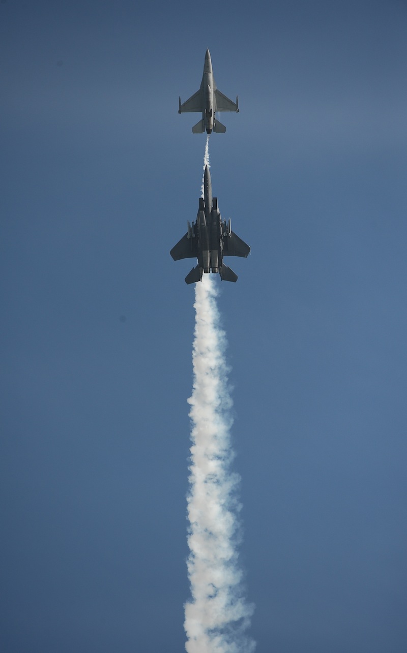 2012年1月27日上午,新加坡空军F-15SG战机与F-16C战机演练“咬尾飞行”。