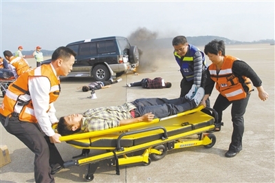 随后,人员疏散时出现踩踏现象,救护车因道路拥堵无法将伤员送往附近医院救治,交通运输部南海第一救助飞行队使用直升机将伤员运往市区救治,闻讯而来的传媒和群众急切要求公布伤亡人员名单和事故真相,海事部门搜救落水飞行员,特种设备部门调查坠机原因,有关部门三度召开新闻发布会并采用微博等方式及时公布信息……演练指挥人员沉着应对,各救援组协同作战。