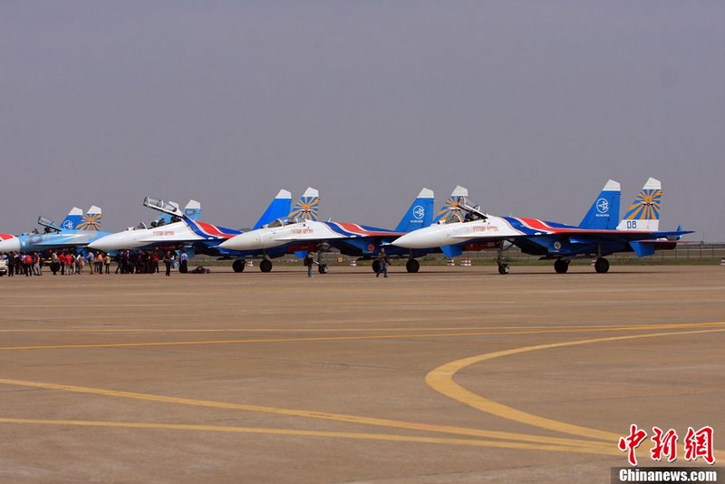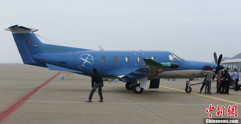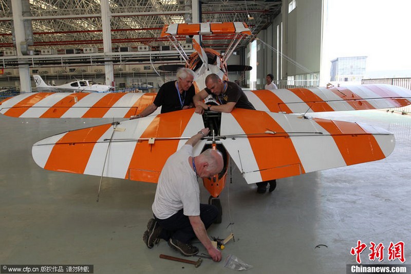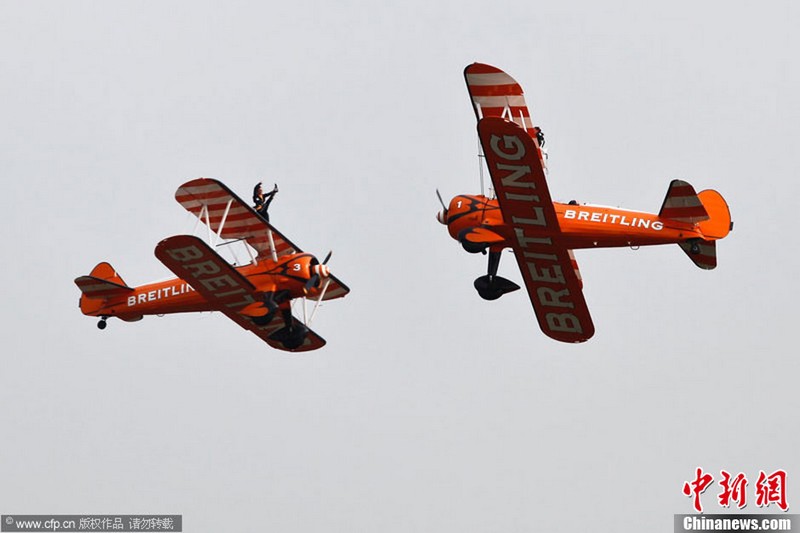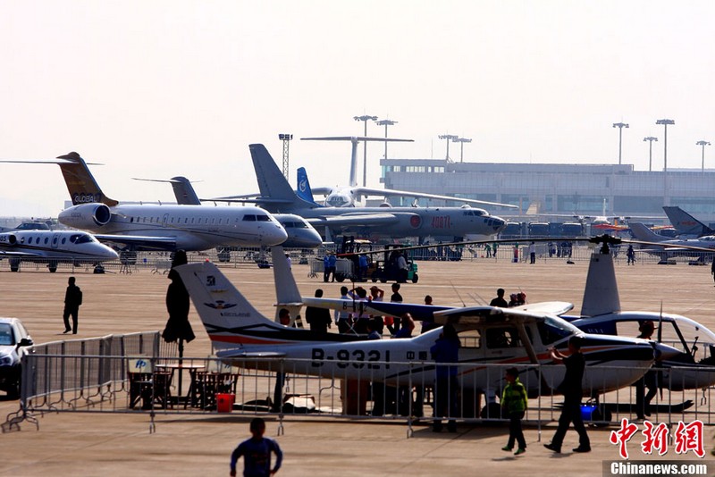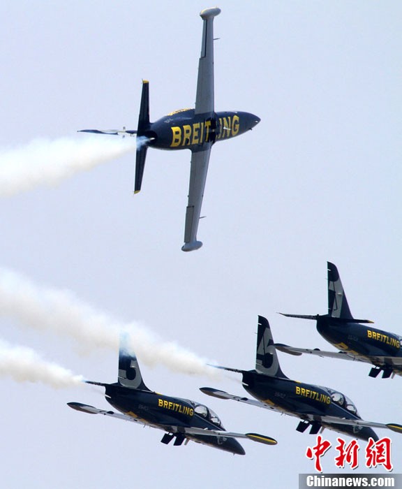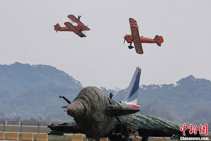 承办中国航展的珠海航展有限公司副总经理杨贤刚介绍,第九届中国珠海航展有来自39个国家和地区近650家中外航空航天厂商参展,根据最新的参展飞机清单,本届航展上的各类飞行器实物将为114架,包括歼击机、直升机、客机、公务机、水陆两栖多用途飞机等,有近50架将动态飞行展示;飞行表演将集中在 11月16日-18日。图为一台被包裹得严严实实的“棕子机”,其上方则是“百年灵”机翼行走飞行特技表演队在进行训练。