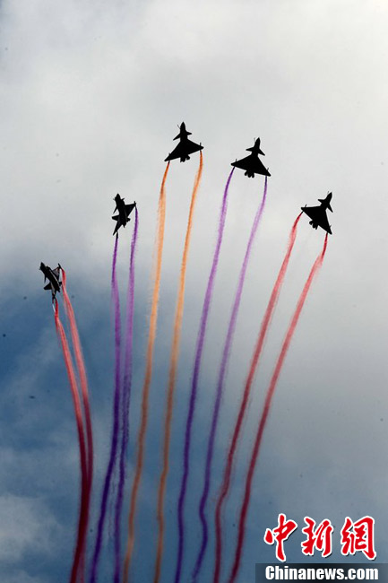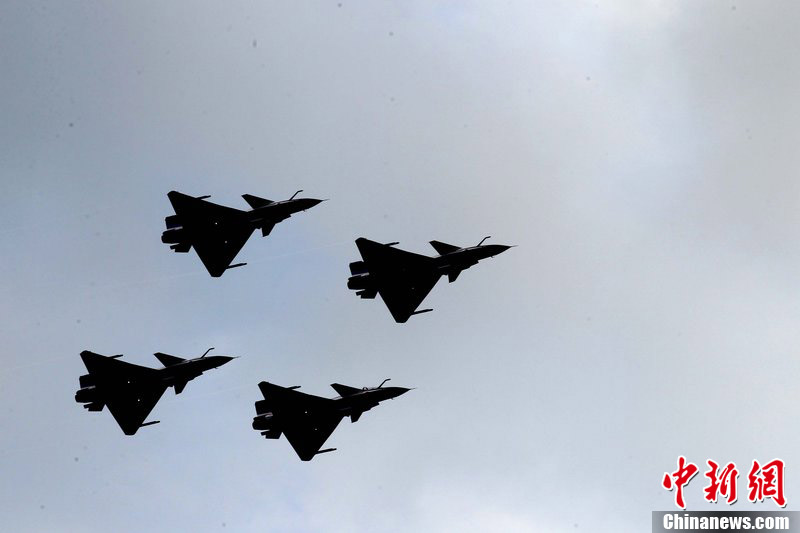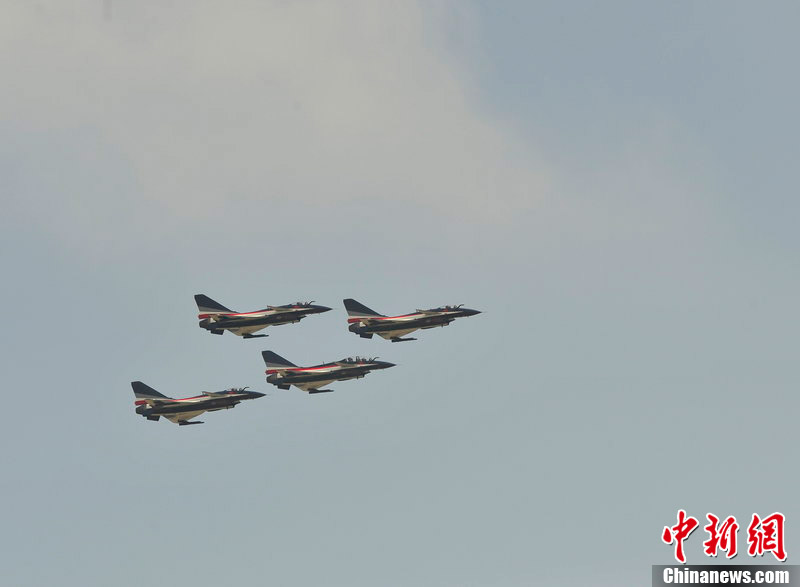 2012年11月10日,广东省珠海市,八一飞行表演队歼十战机做编队飞行练习。八一飞行表演队将在珠海航展上做精彩编队飞行表演。