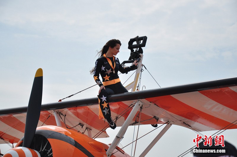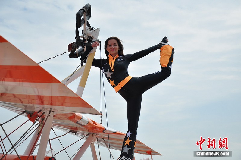 机翼上的芭蕾:美女特技演员机翼上跳舞