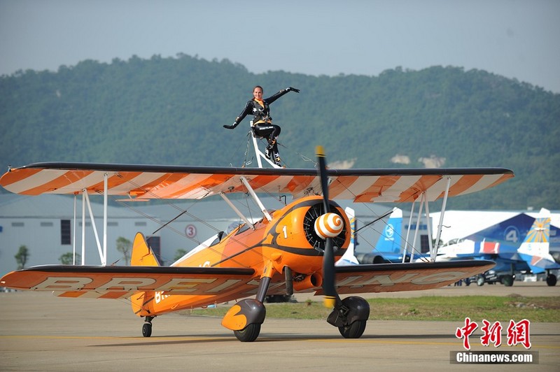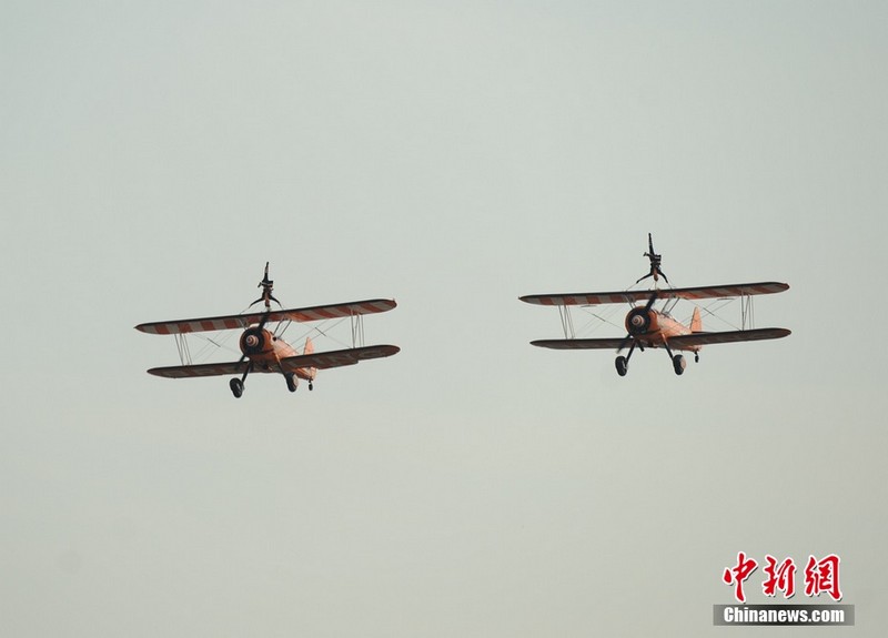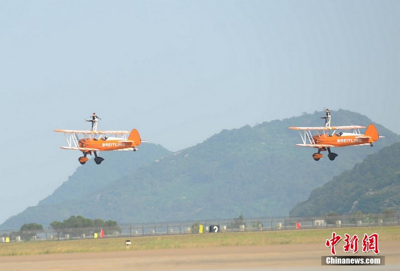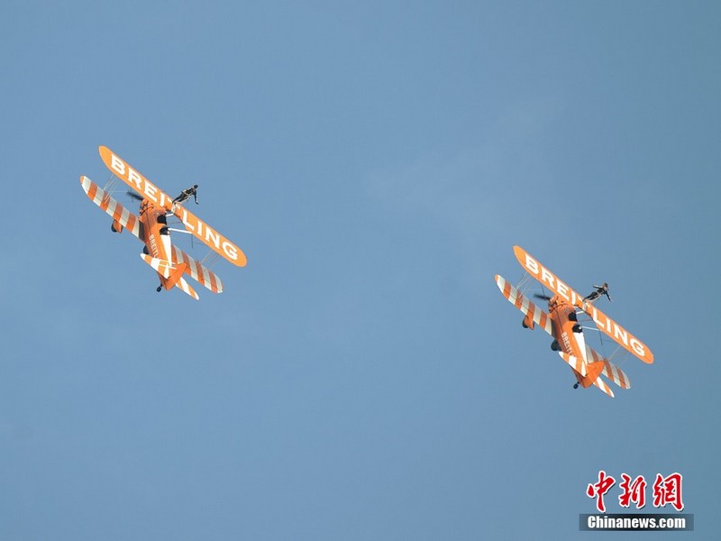11月11日下午,欧洲“百年灵”机翼行走飞行表演队表演了精彩的“云中漫步”。两架飞机上各站有一名美女,在空中表演独门舞步和杂技,随飞机一起“云中漫步”,优雅精准。