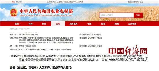 经济日报-中国经济网北京7月14日讯 近日,中央农办、农业农村部、发展改革委、财政部、人民银行、银保监会、证监会等7部门联合印发《关于扩大农业农村有效投资 加快补上“三农”领域突出短板的意见》(以下简称《意见》),部署扩大农业农村有效投资,为打赢脱贫攻坚战和全面建成小康社会提供坚实支撑。