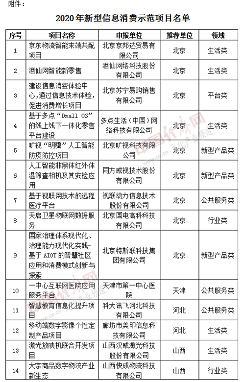 经济日报-中国经济网北京8月11日讯 日前,工业和信息化部公示了2020年新型信息消费示范项目,共100个项目入选。