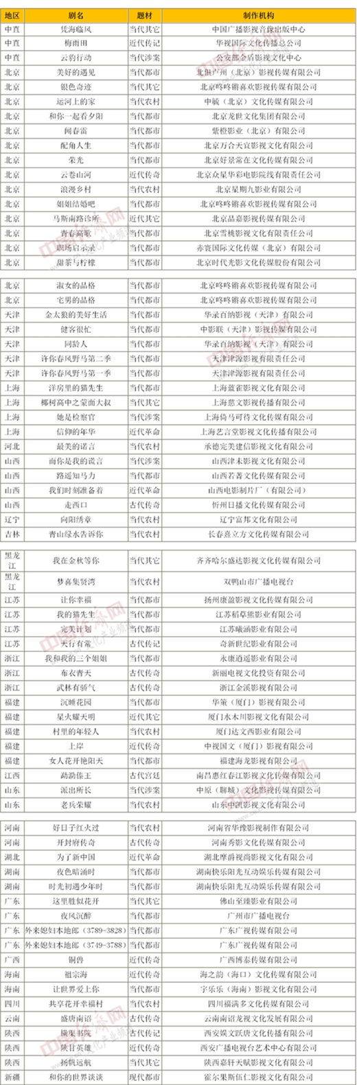 《国家广播电视总局办公厅关于2020年9月全国拍摄制作电视剧备案公示的通知》明确,按题材划分,当代题材50部、1619集,分别占公示总数的71.43%和71.01%,其中,当代都市题材30部963集,当代农村题材10部349集,当代涉案题材4部130集,当代其它题材6部177集。