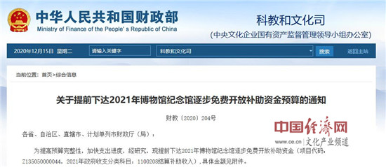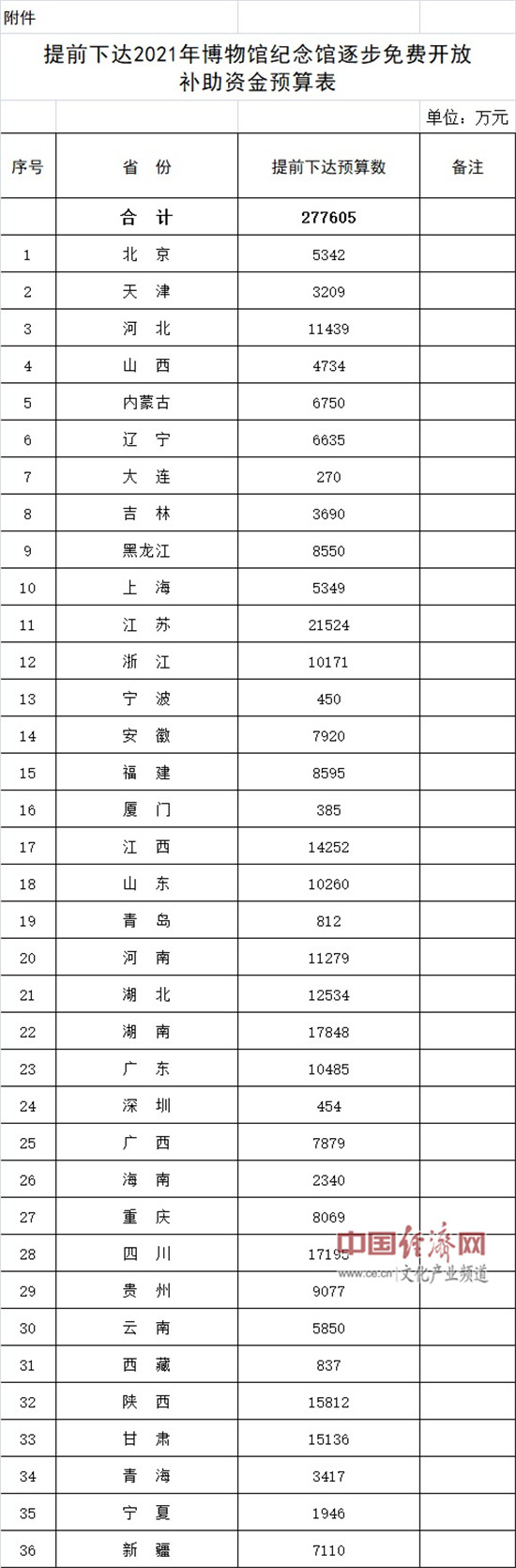 经济日报-中国经济网北京12月15日讯 近日,财政部官网发布了《关于提前下达2021年博物馆纪念馆逐步免费开放补助资金预算的通知》,31个省(自治区、直辖市)及5个计划单列市补助资金预算总计277605万元。