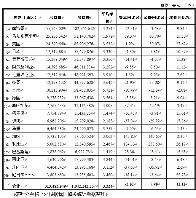 2012年我国茶叶出口海关统计