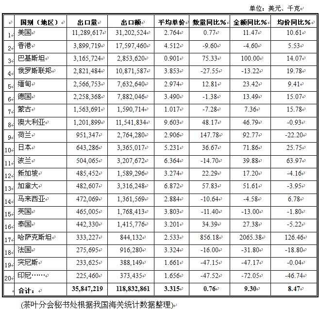 2012年我国红茶出口海关统计
